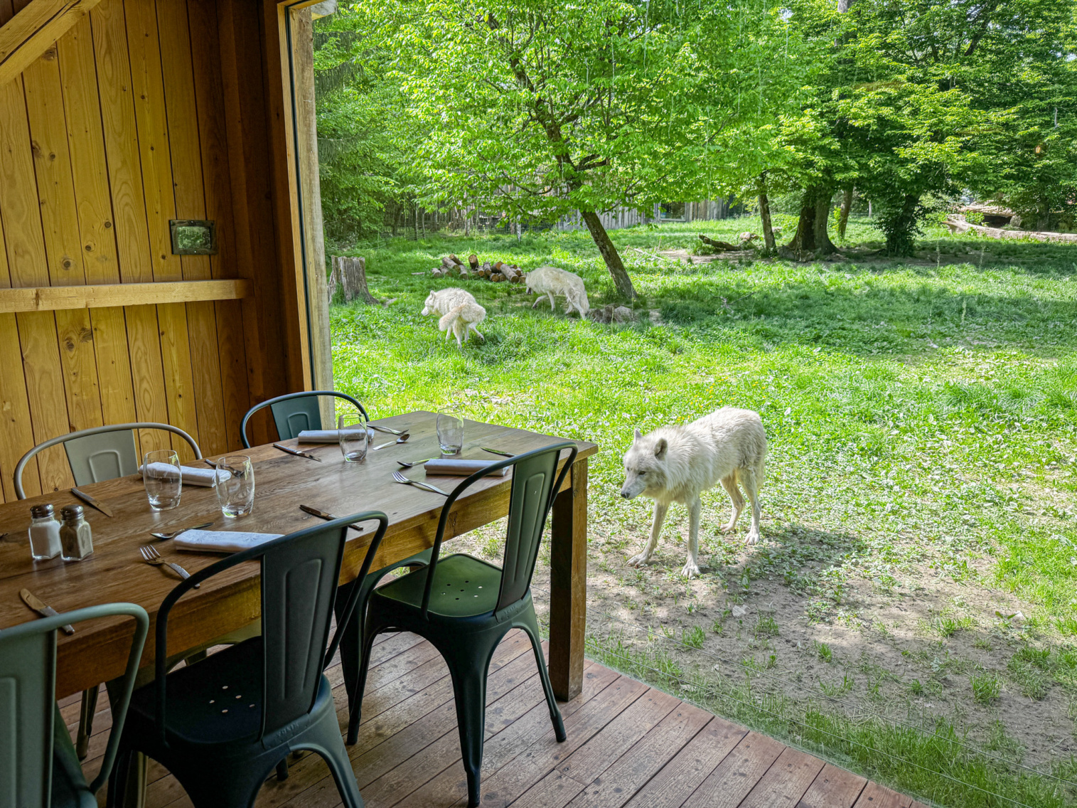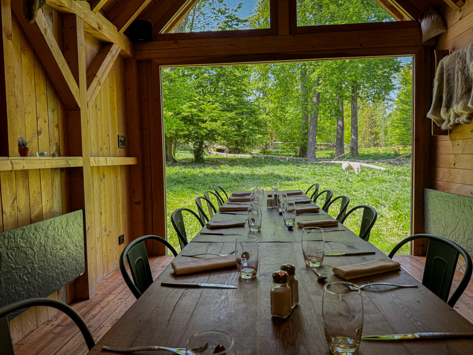 Une ambiance chaleureuse et intimiste, face aux loups blancs, pour des réunions ou repas en petit groupe en totale immersion.
